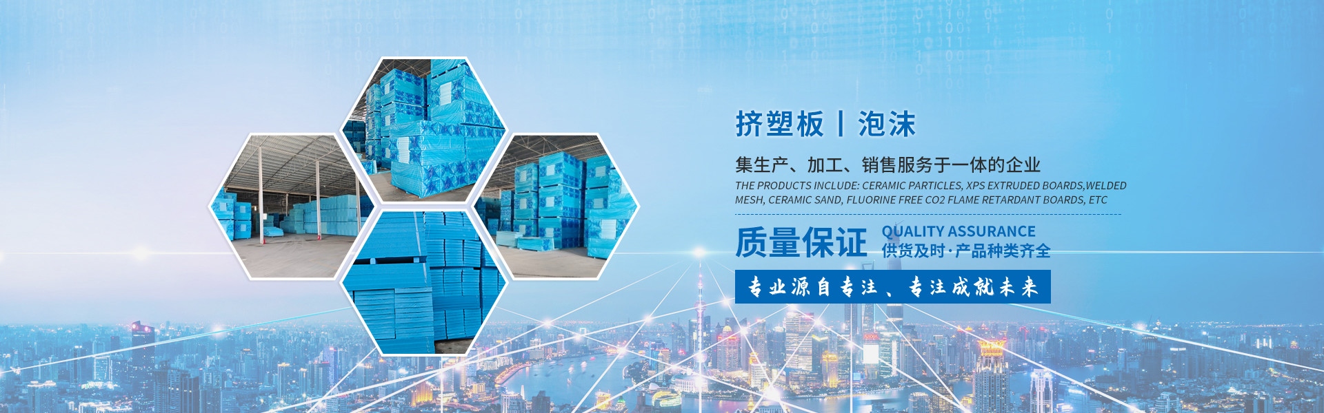 產(chǎn)品有:陶粒、XPS擠塑板、陶砂、無氟co2阻燃板、擠塑復(fù)合板。配送材料有:碰焊網(wǎng)、專用膠水、泡沫板、巖棉板、玻璃棉氈、珍珠巖、聚酯無紡布、纖維網(wǎng)格布等。